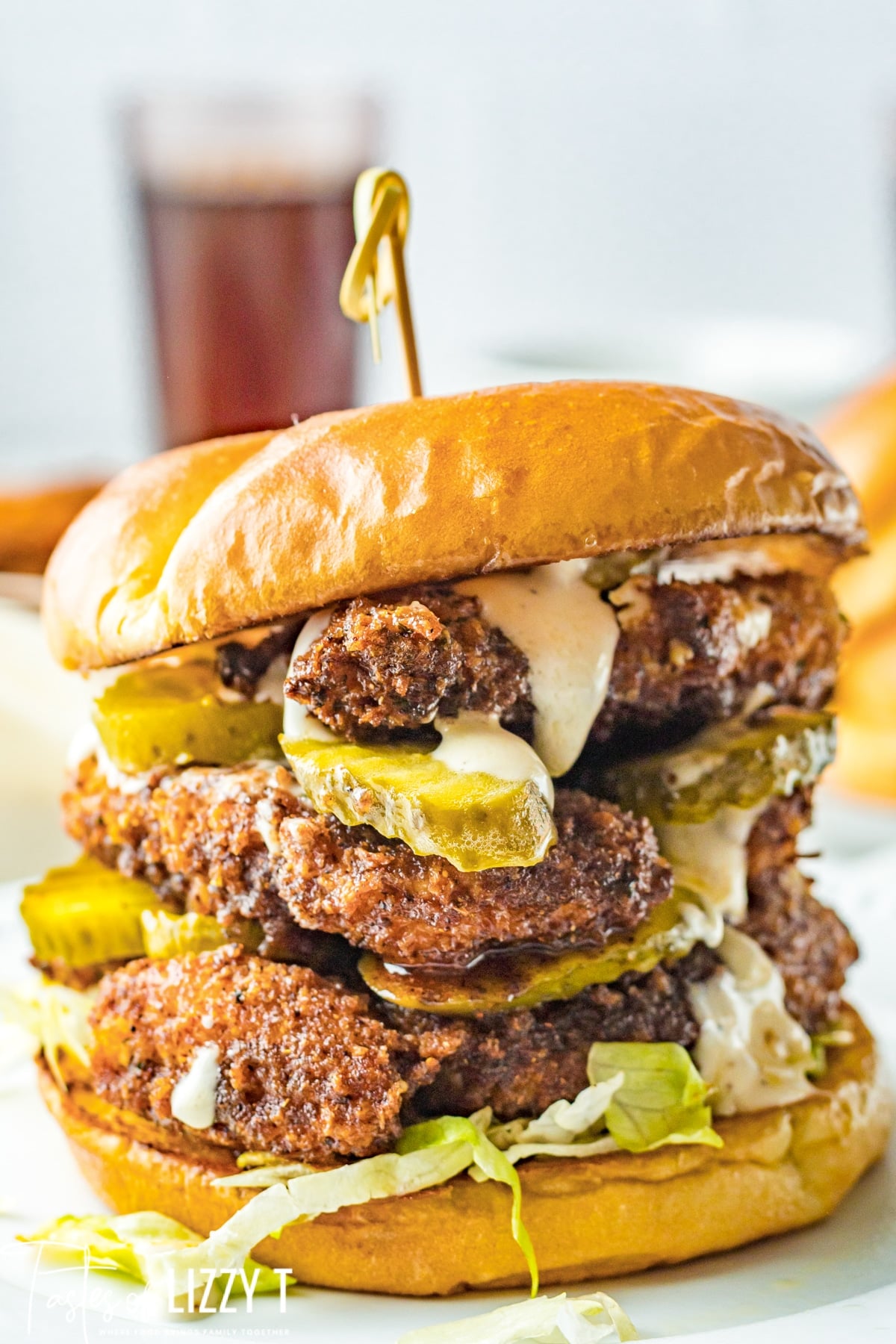 - Place a good serving of lettuce on the bottom of the bun. Stack pieces of chicken on the lettuce, add plenty of pickles and drizzle with ranch. Place the top bun back on and serve.
