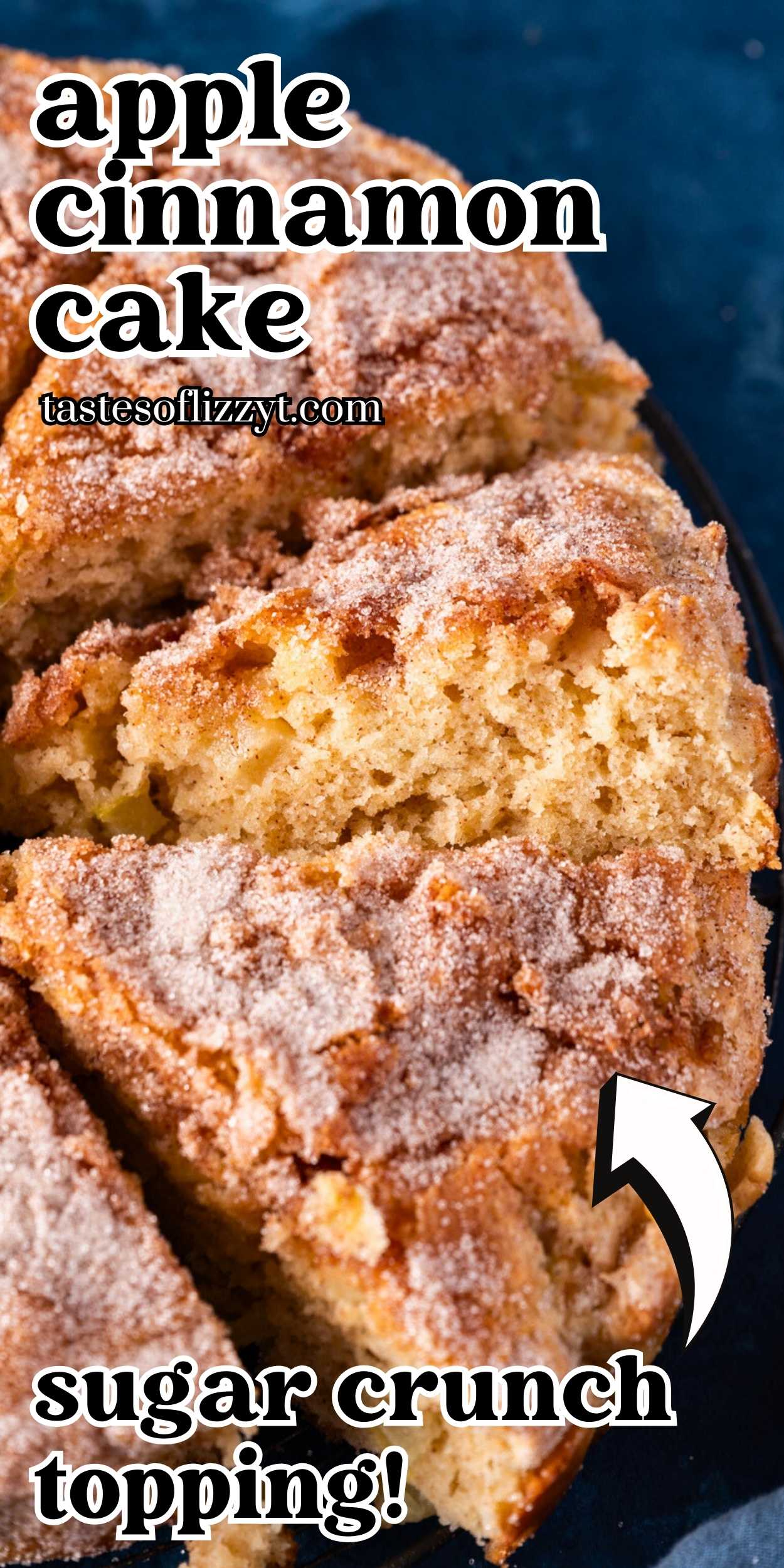 Assemble and bake. Spread the batter in the prepared baking pan. Sprinkle the remaining ¼ cup of sugar evenly over the top of the cake batter. Bake 35-40 minutes at 350ºF. The top of the apple cinnamon cake will be crackly and lightly browned and the center may still jiggle just a bit.
