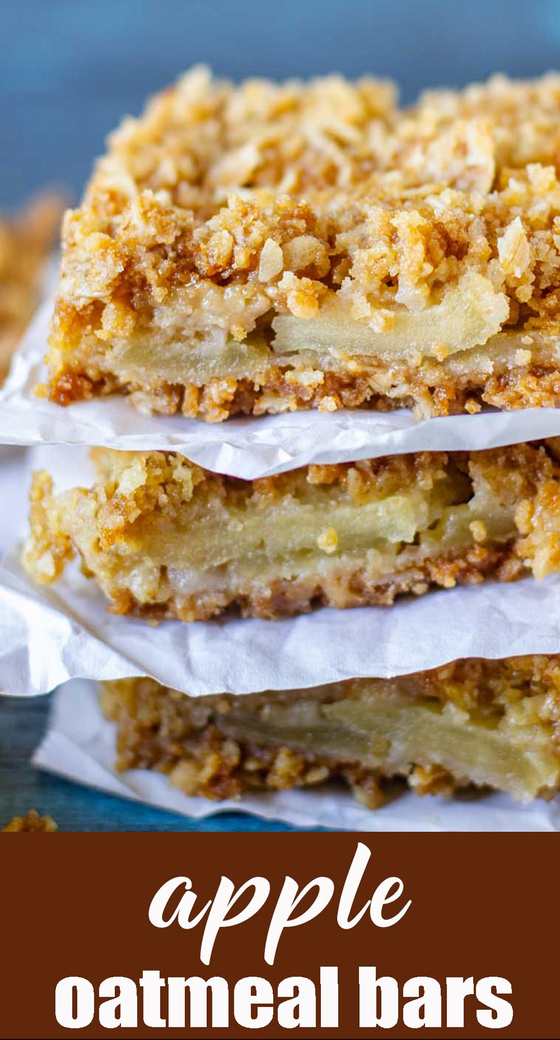 Layered Apple Oatmeal Bars make an easy apple dessert. Apple slices are stuffed between a soft, buttery, brown sugar and oatmeal crust and topping.