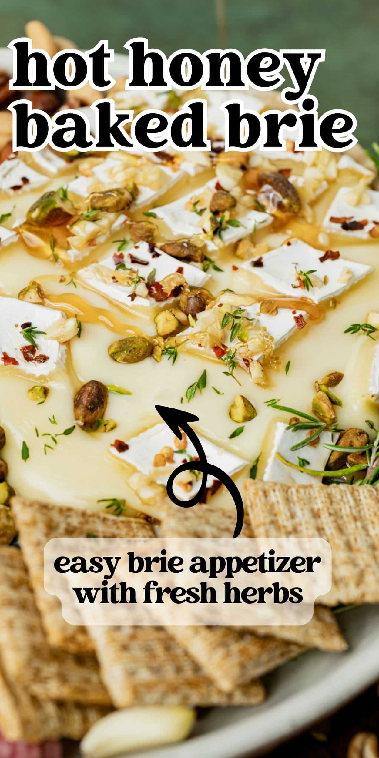 • Top the baked brie with the fresh thyme leaves, chopped pistachios, then drizzle with additional honey. 1 tablespoon fresh thyme leaves, 2 tablespoons chopped pistachios, 2 tablespoons hot honey