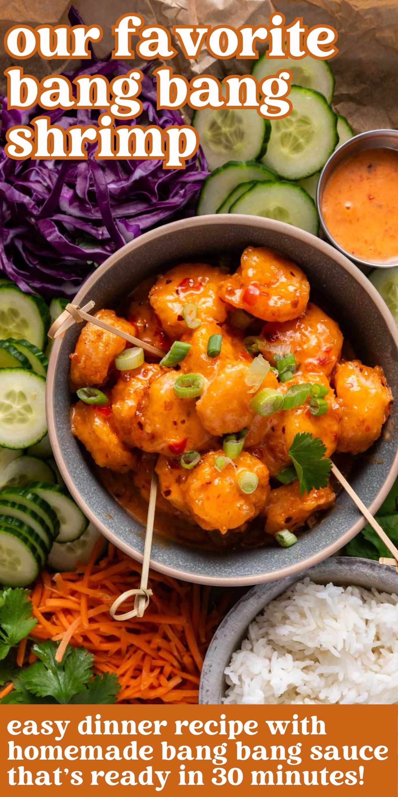 This bang bang shrimp is such a versatile dinner. Matt piles his over rice, I load mine in a bowl with cucumbers, cabbage and carrots, and if we’re having family over I’ll set it out as an appetizer next to our other takeout-style favorites.