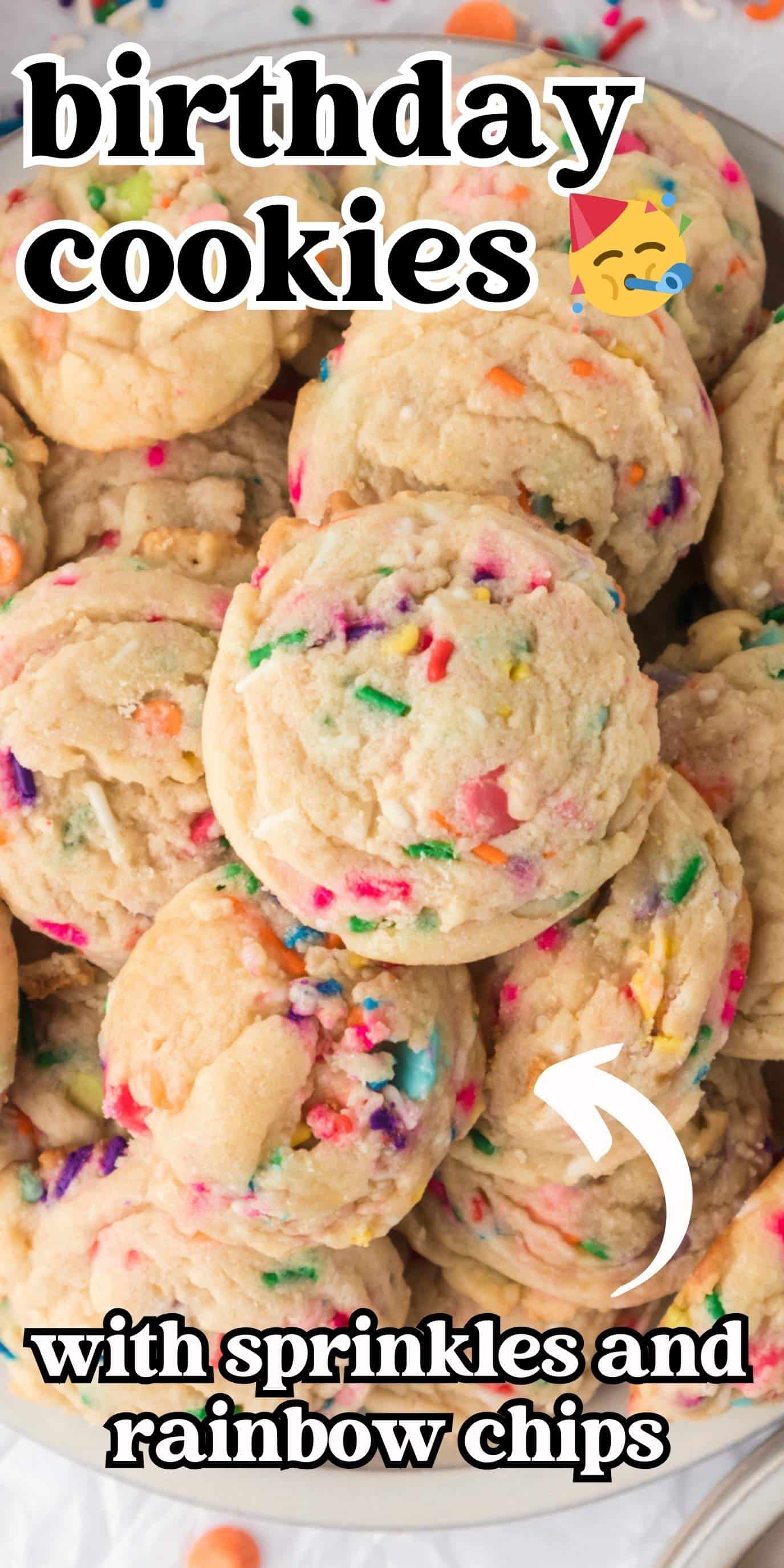 Celebrate birthdays with these sprinkle and rainbow chip birthday cookies! Traditional vanilla sugar cookie base loaded with festive color.