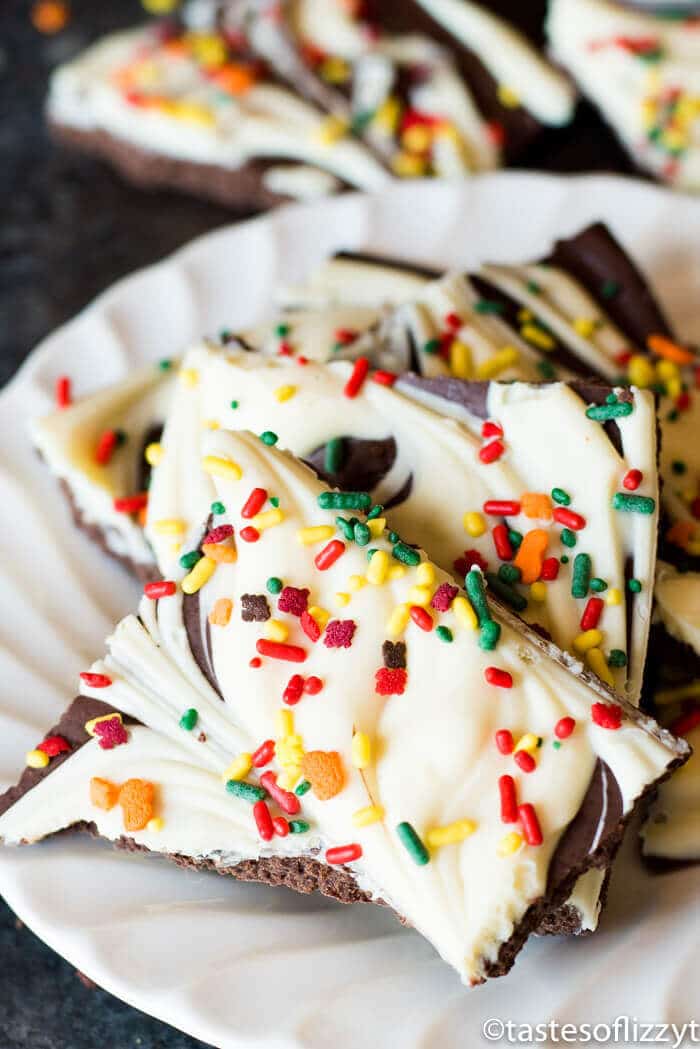 - Scoop white chocolate by spoonfuls onto milk chocolate and, using a knife or a toothpick, swirl around to create a marbled effect. Top with sprinkles if desired.