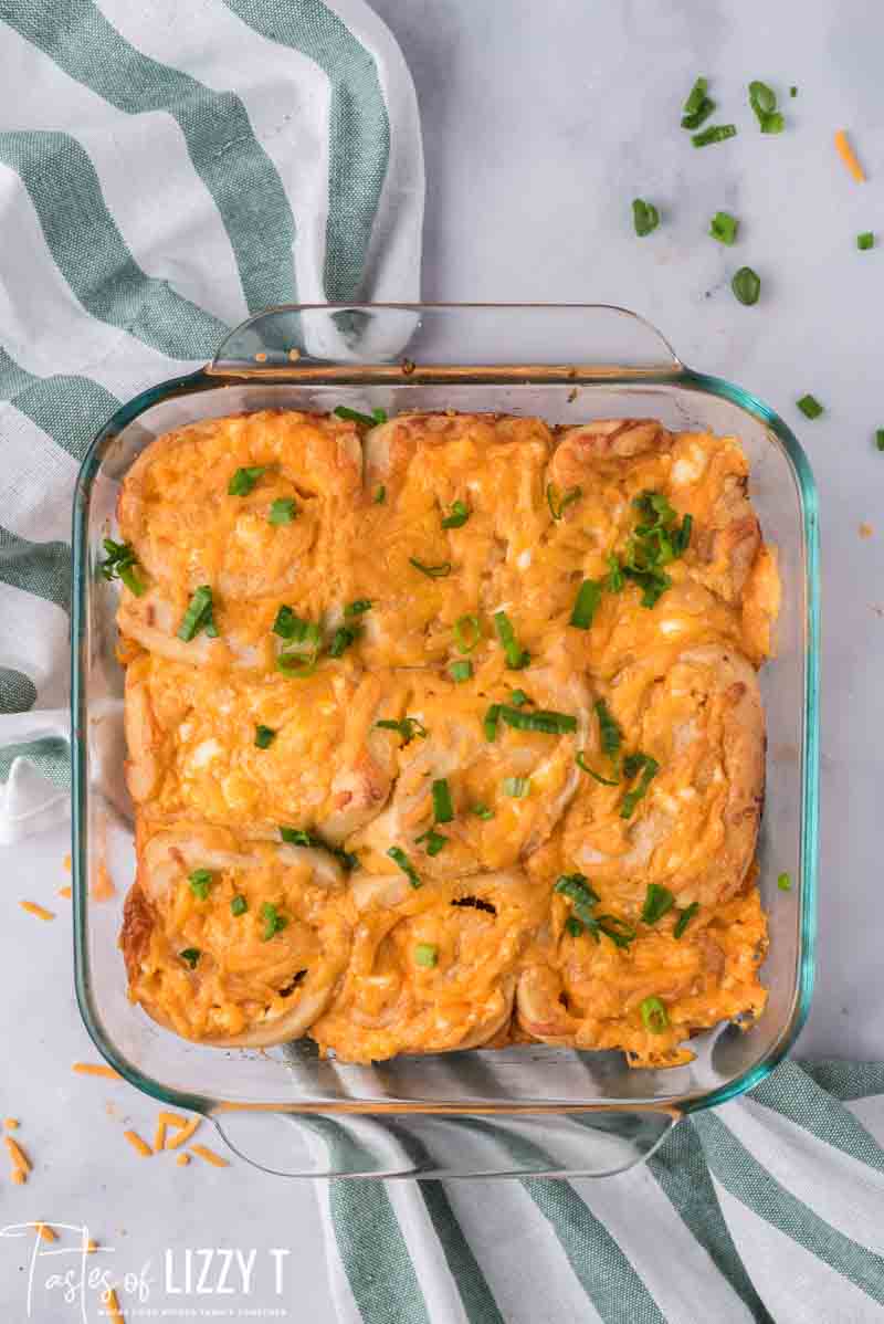 - Roll and cut the pinwheels into smaller sizes so you get more “bite size” rolls which is great for potlucks. When we do this it bakes in a 9×13 pan and makes a delicious game day appetizer.