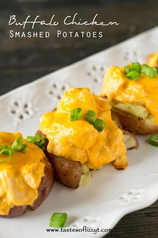 Crispy oven roasted round red potatoes are topped with a creamy, cheesy buffalo chicken sauce. These spicy Buffalo Chicken Smashed Potatoes are great as an appetizer, side dish or main dish!