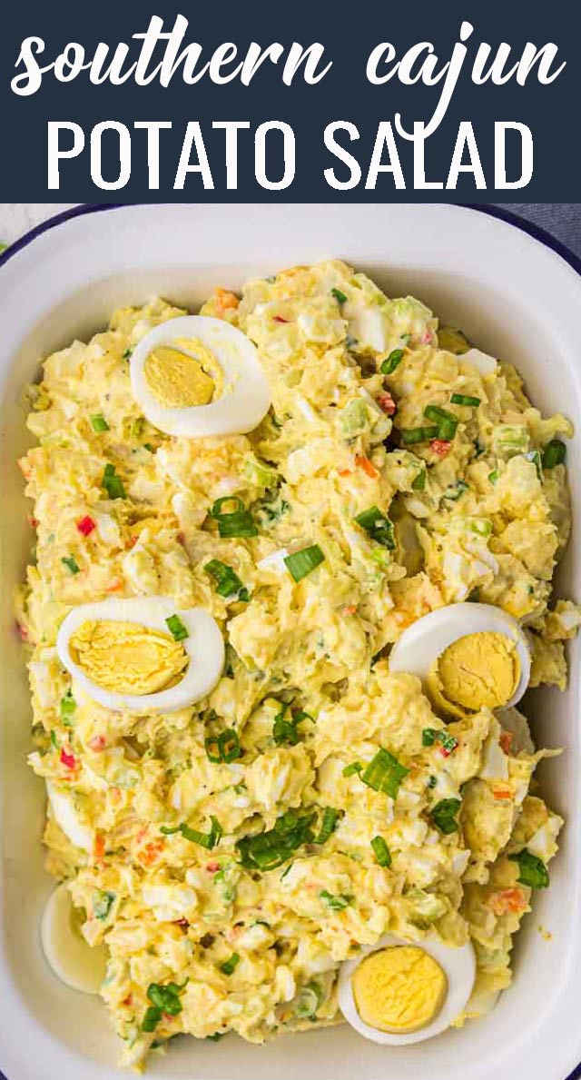 A cajun potato salad made southern style with eggs, sweet relish and cajun seasoning. Perfect to pair with gumbo!
