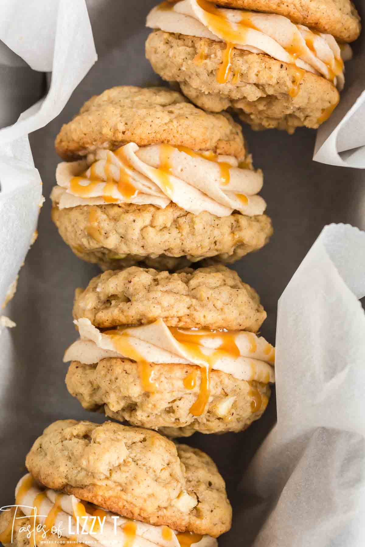 Soft and chewy caramel apple cookie sandwiches are filled with brown sugar and cinnamon buttercream frosting and a drizzle of salted caramel. Think of the perfect caramel apple pie you can eat with your hands.