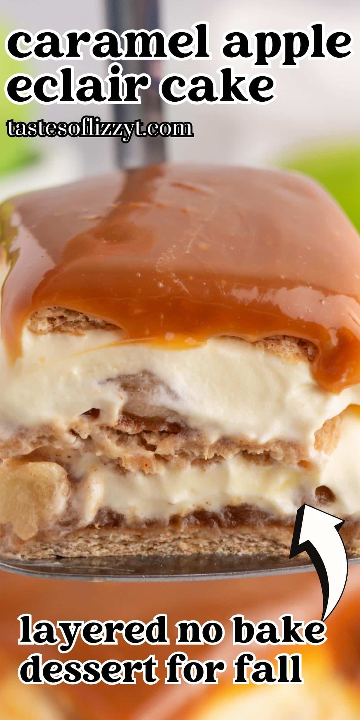 Serve this no bake Caramel Apple Eclair Cake recipe on cool fall days. Layers of graham crackers, cinnamon fried apple filling and creamy vanilla pudding, all topped with a sweet caramel sauce.