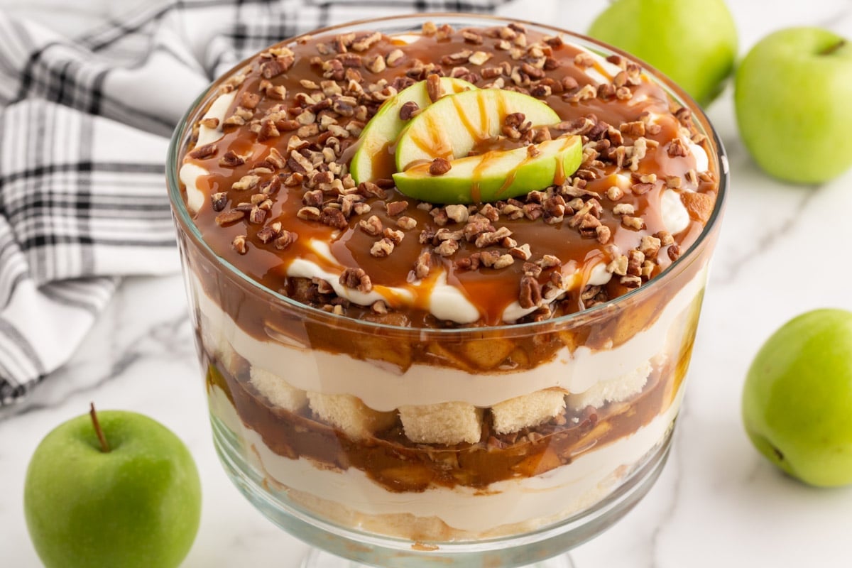 This trifle is an easy, no-bake fall dessert that feeds a crowd! Use frozen pound cake and pre-cook apples for the layers and simply assemble when it's time to serve!