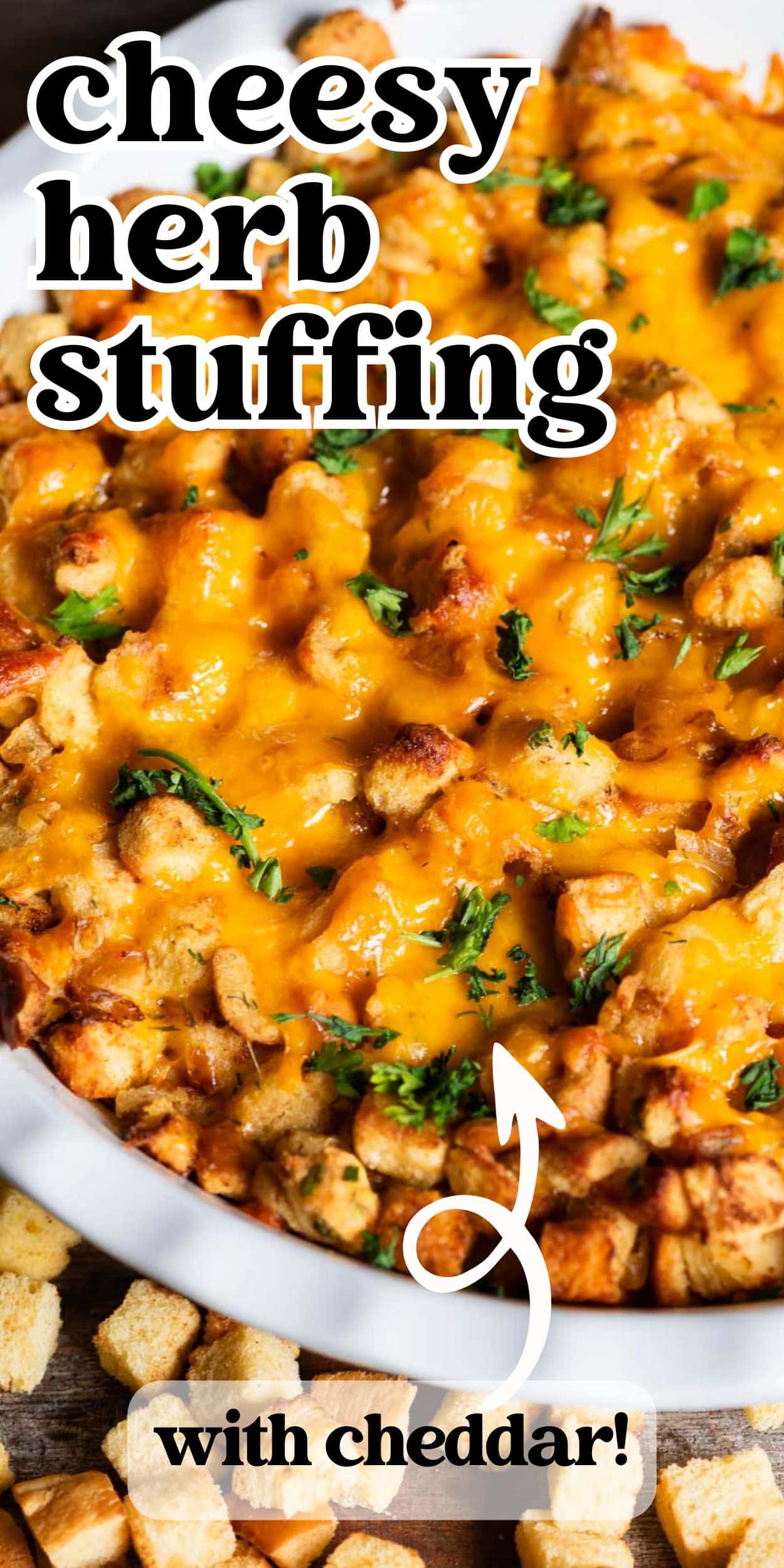 - Herbs and Seasonings: To switch things up from traditional stuffing flavors, I decided to use a mix of dill, chives, and fresh parsley since these herbs go so well with cheddar cheese. I used dried dill and chives, but fresh parsley. Feel free to use fresh dill and chives if you’d like. You can never go wrong with fresh herbs! If you use fresh herbs, use about a tablespoon of both fresh dill and chives to achieve the same flavor.