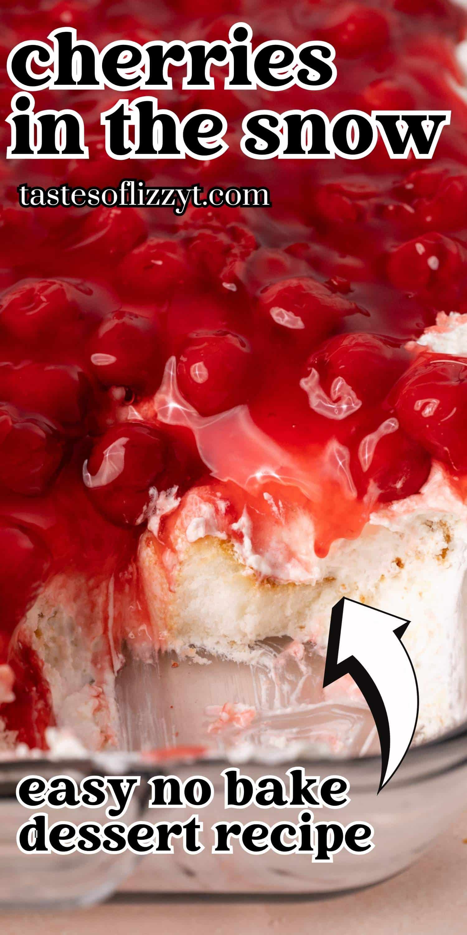 This vintage Cherries in the Snow recipe is an easy, no-bake dessert with just 20 minutes of prep! It layers store-bought angel food cake, a fluffy cream cheese mixture, and cheerful cherry pie filling for a beautiful presentation in a glass baking dish or trifle dish.
