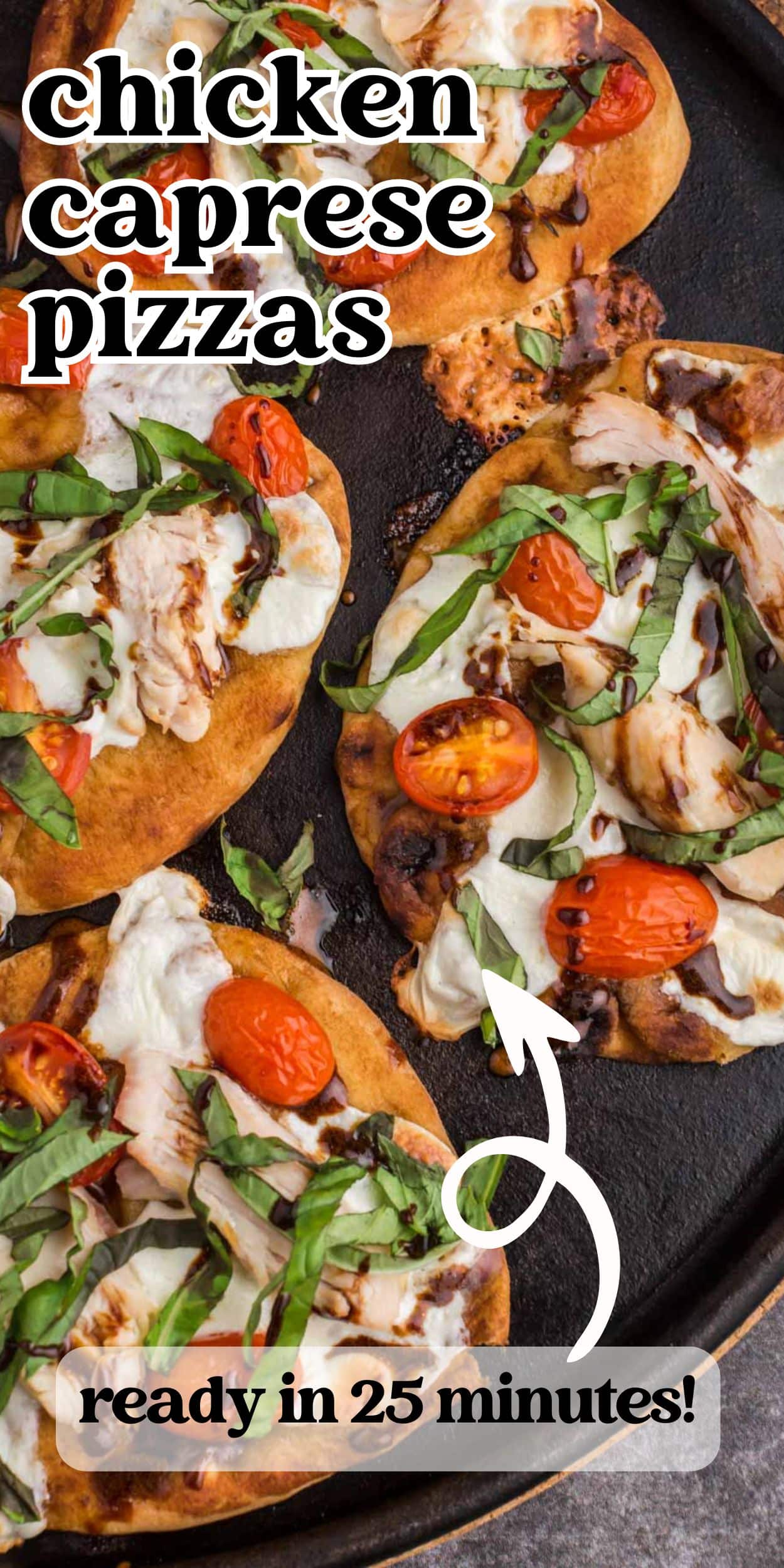 It’s pizza time!! Today we’re sharing one of our easiest recipes: a 30 minute homemade pizza made on naan bread. We’ve made green bean casserole pizzas on naan bread, but this one has all of the flavors of caprese chicken.