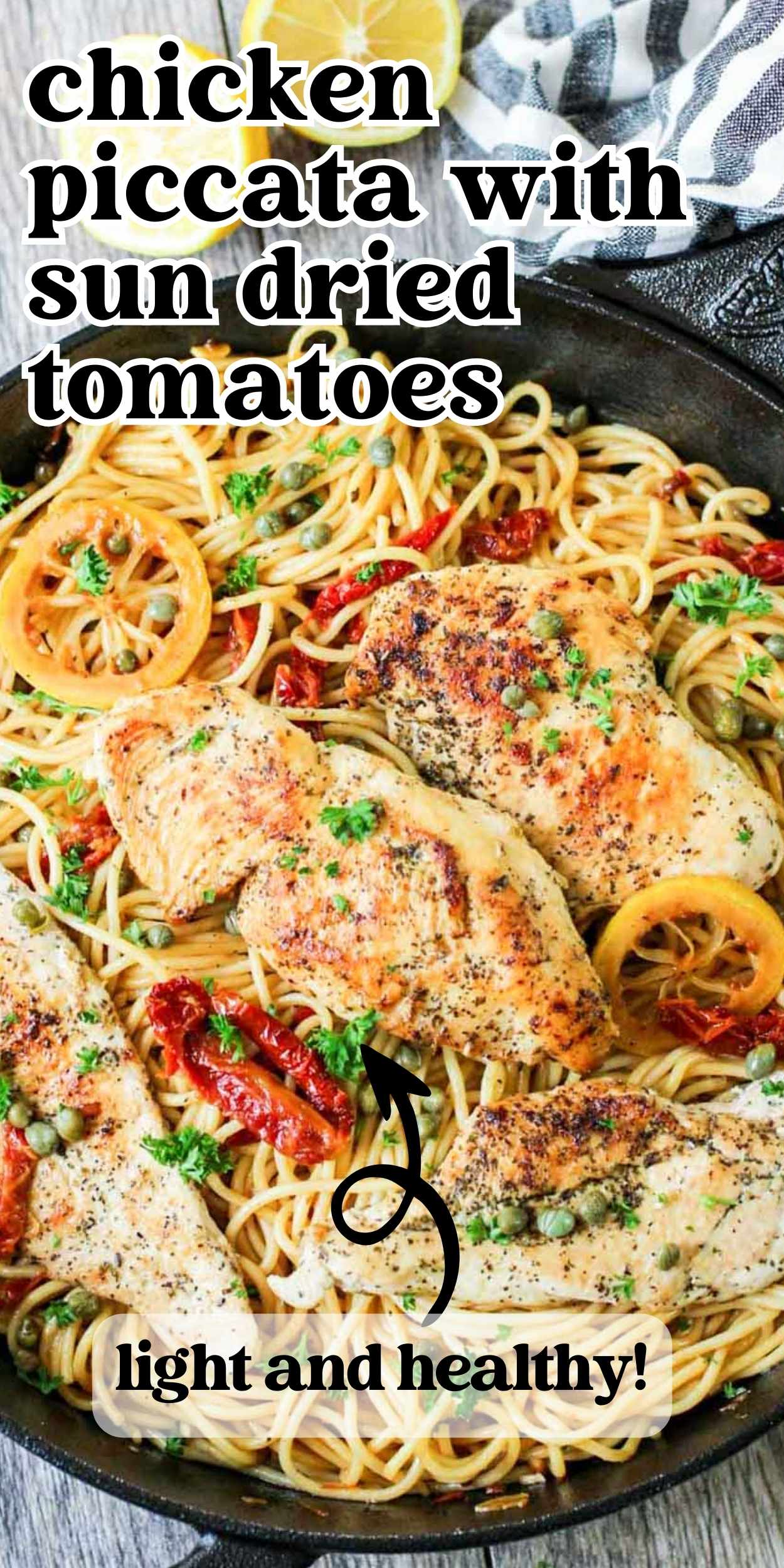 This chicken piccata with sun dried tomatoes is a low carb high protein dinner recipe that is light and healthy.