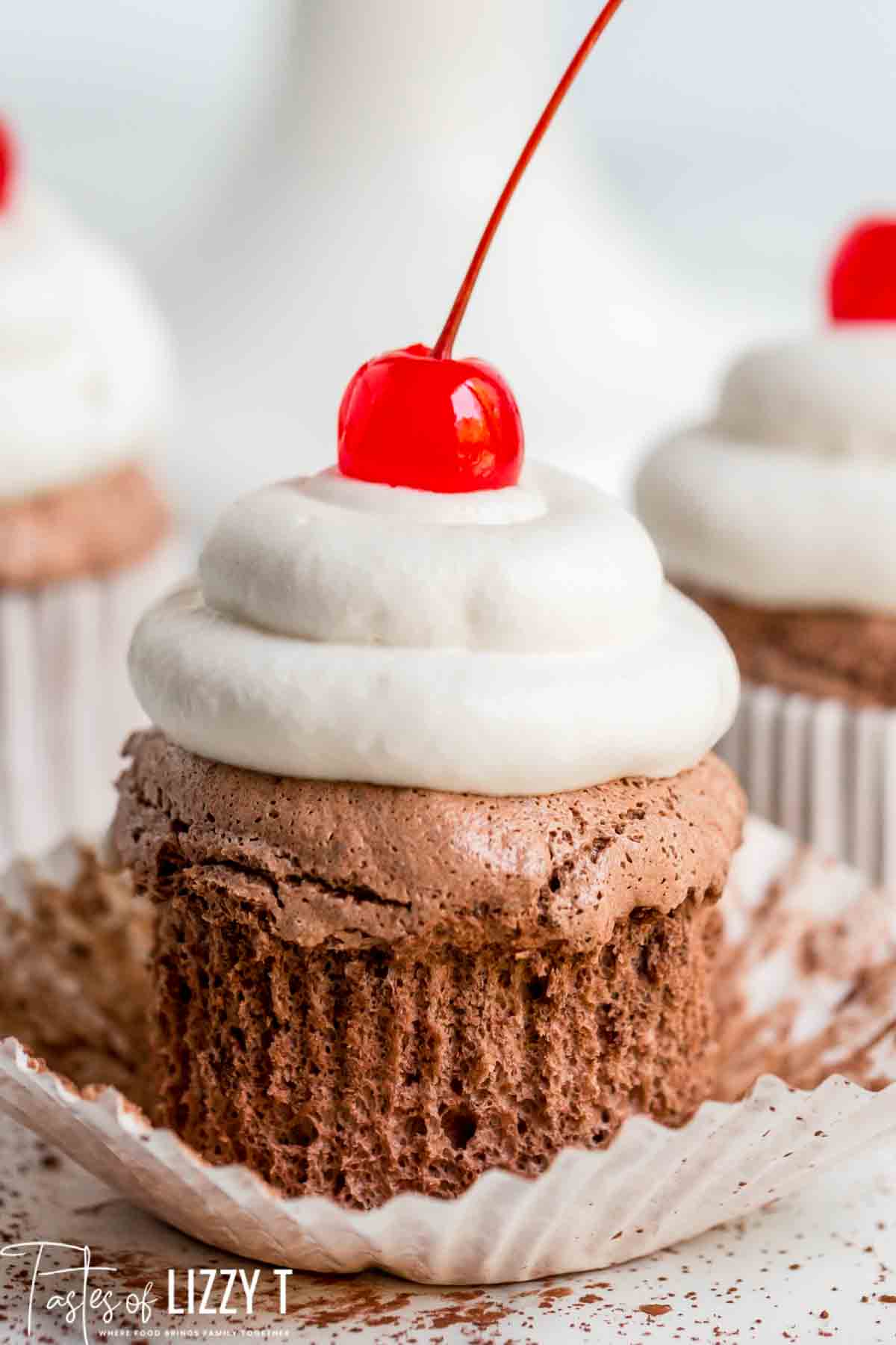 Chocolate angel food cupcakes with whipped cream frosting and topped with a cherry! This light dessert recipe is perfect for a dinner’s finishing touch.