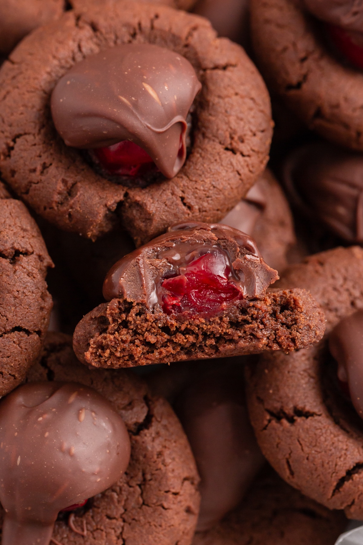 Bite into chocolate covered cherry cookies and find a cherry surprise inside. Simple from-scratch chocolate cookies with a dollop of melted chocolate on top.
