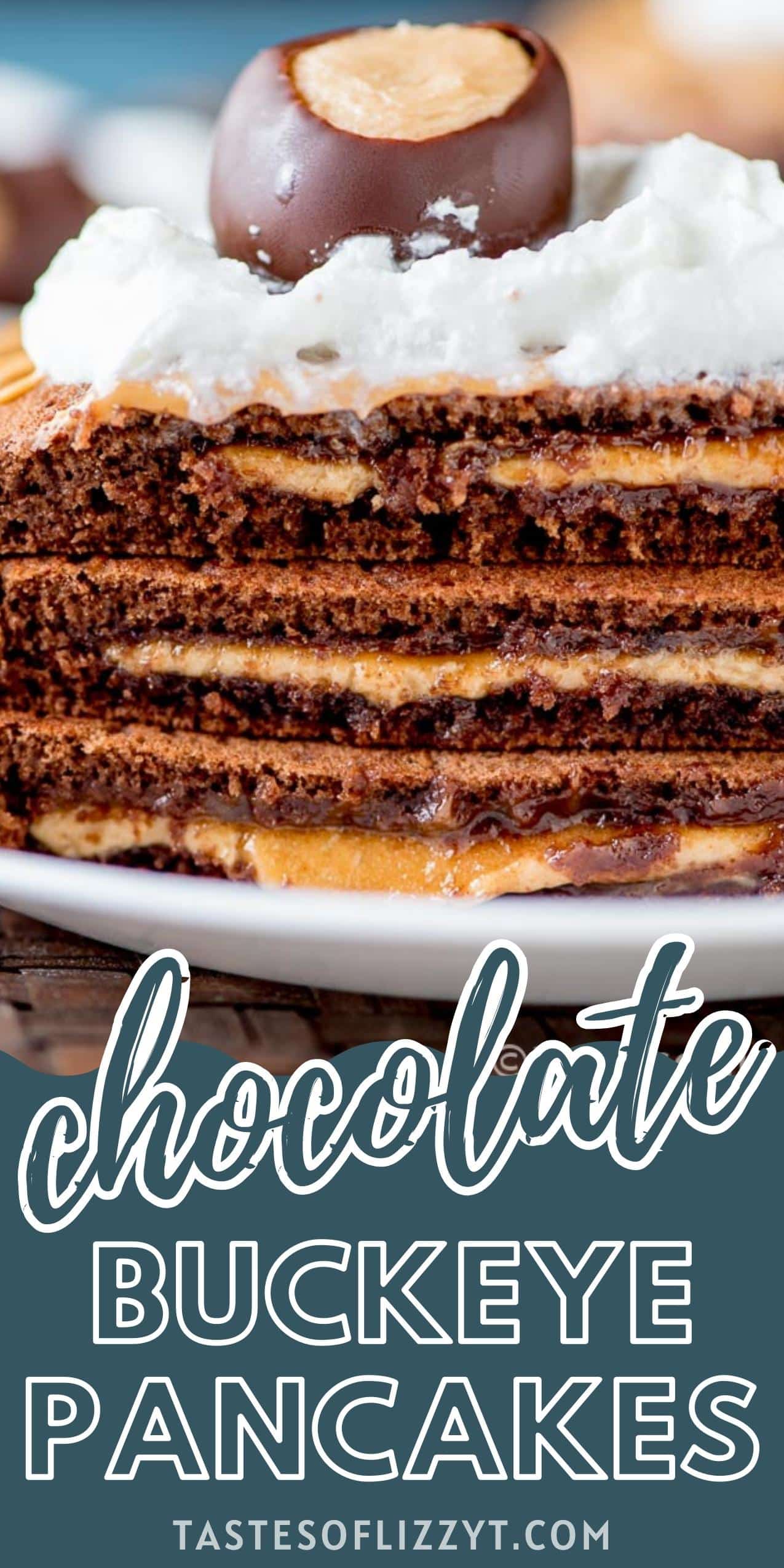 Chocolate pancakes stuffed with homemade buckeye peanut butter filling, then drizzled with melted peanut butter and topped with whipped cream. If your thought is, it doesn’t get much better than this, take a peek at our other buckeye recipes!