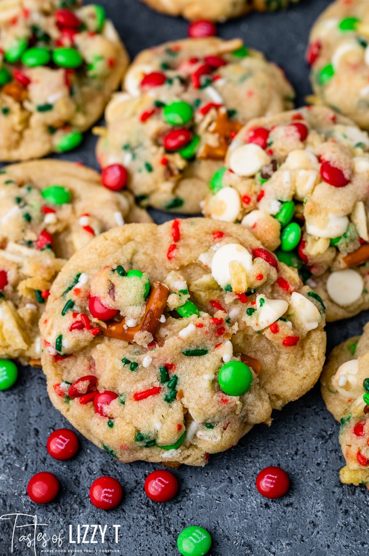 Christmas Kitchen Sink Cookies loaded with pretzels, chips, M&Ms and white chocolate will brighten your Christmas cookie plate!