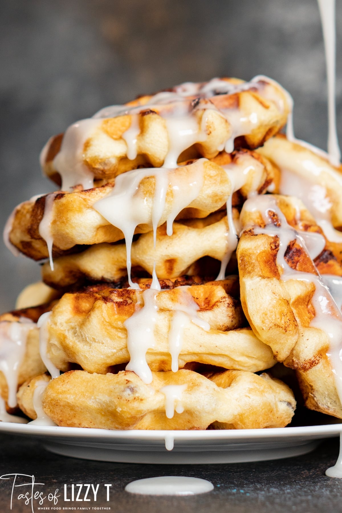 Want to make cinnamon roll waffles from scratch? Here’s what you should do. Make our Belgian waffle recipe and the cinnamon swirl from our cinnamon roll pancakes.