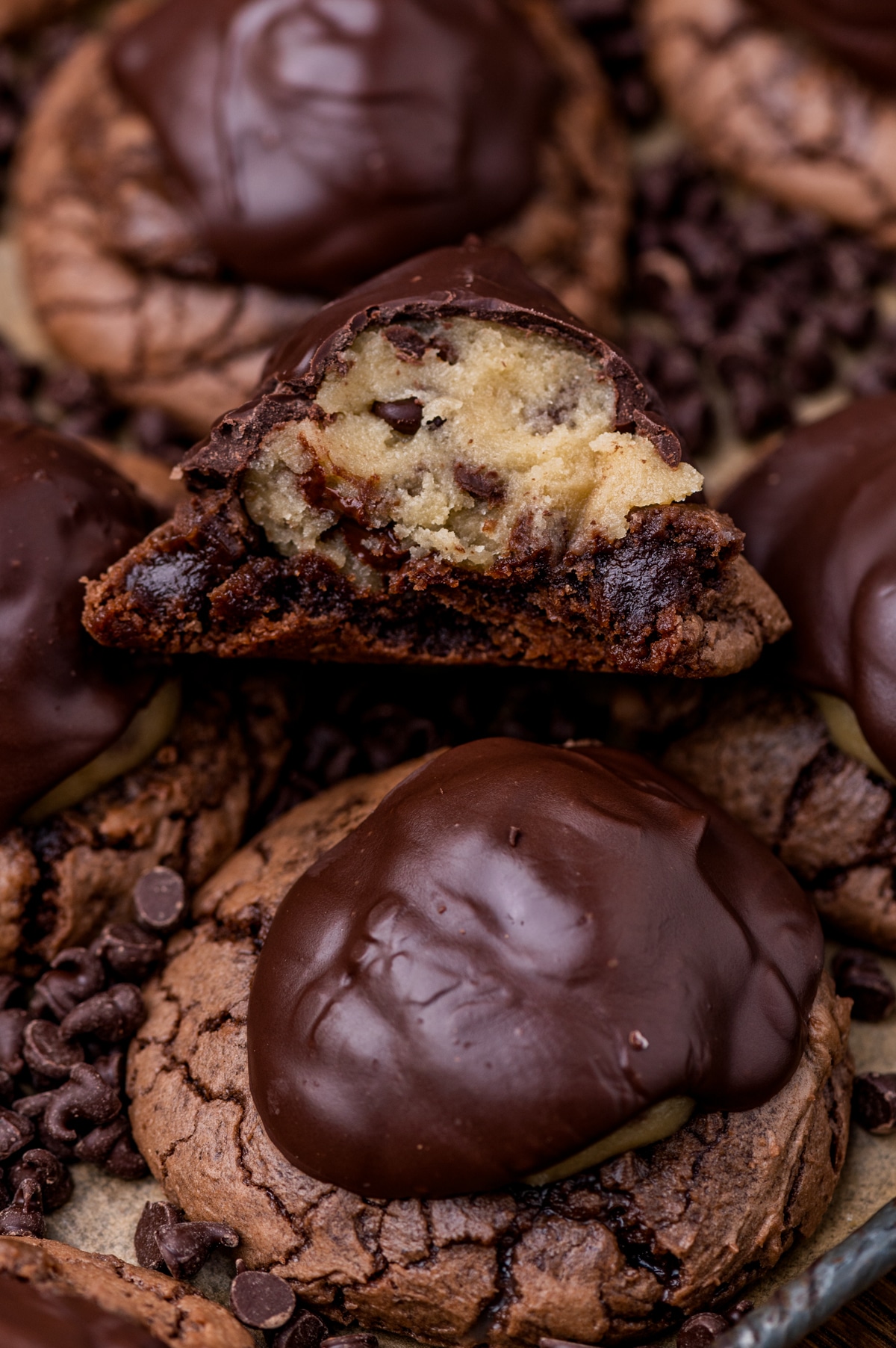 Cookie Dough Brownie Cookies are made special by a cookie dough center. Topped with chocolate, these are a decadent treat for cookie lovers of any age.