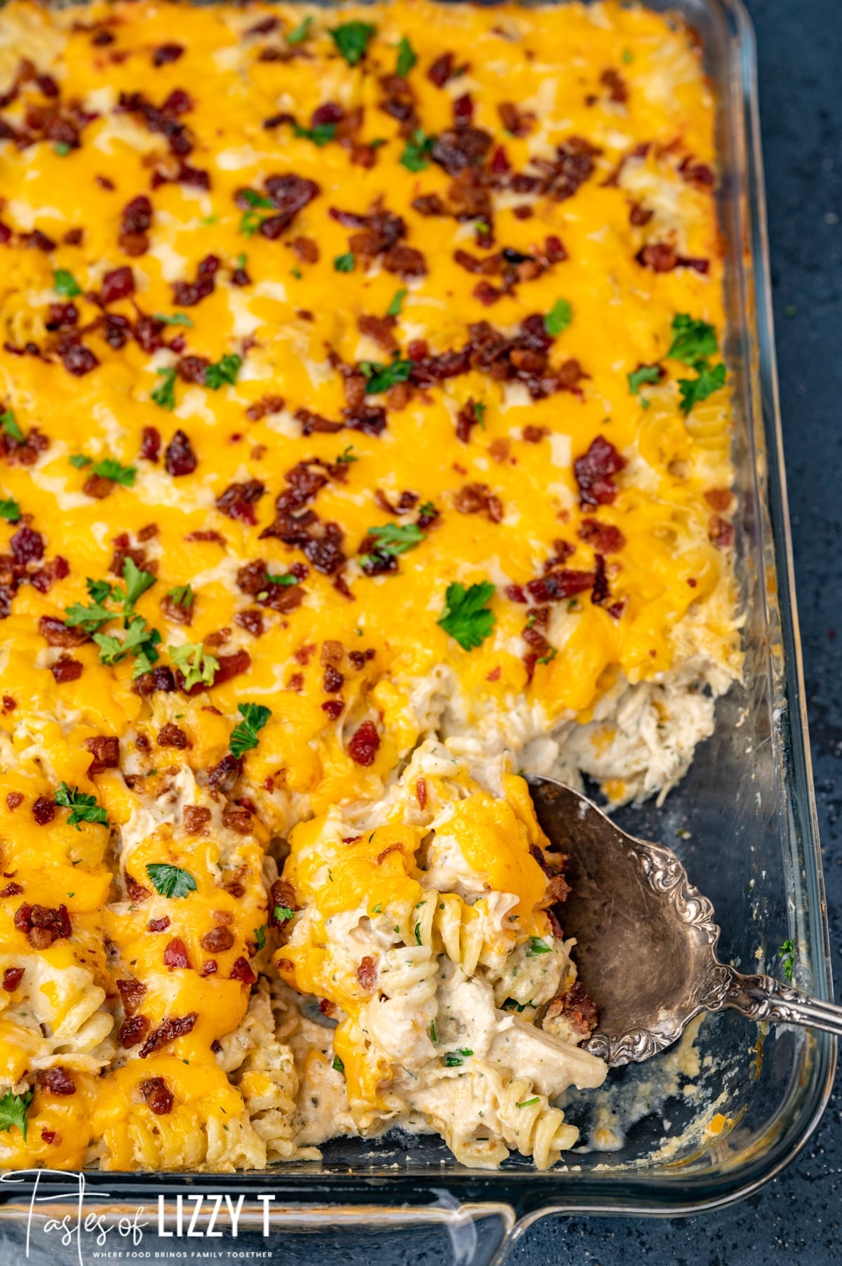A casserole the whole family will love! Crack Chicken Pasta Bake with creamy ranch sauce, cheddar, mozzarella and bacon.