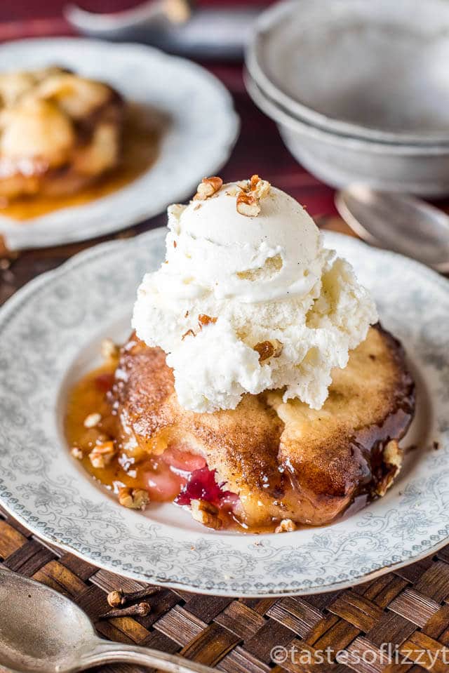Recipe Note: I’ll warn you that the recipe makes a lot of syrup. The poor little dumplings are going to look like they are almost drowning. The sauce will slightly bake down and thicken just a bit as it cooks. This is the sauce that makes the dumplings so soft and gooey and is most delicious when you pour it over ice cream. If you find the sauce to be too much for your liking, you can cut the sauce ingredients in half.