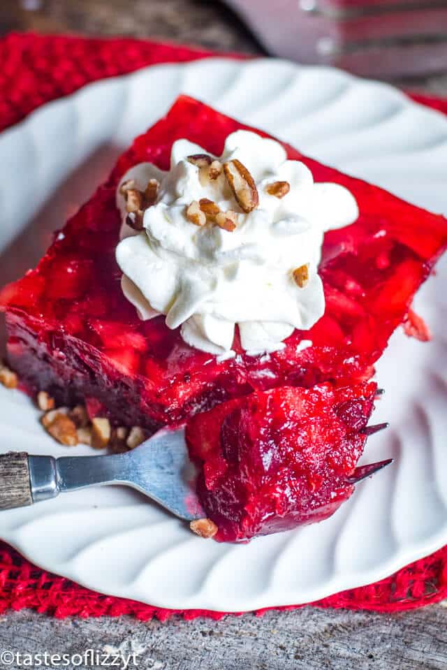 Easy, festive Cranberry Jello Salad with pineapple and raspberry gelatin. Three fruit flavors combine to make a gorgeous red fruit dessert that you can serve with a dollop of whipped cream. It’s as festive as our orange cranberry cake!