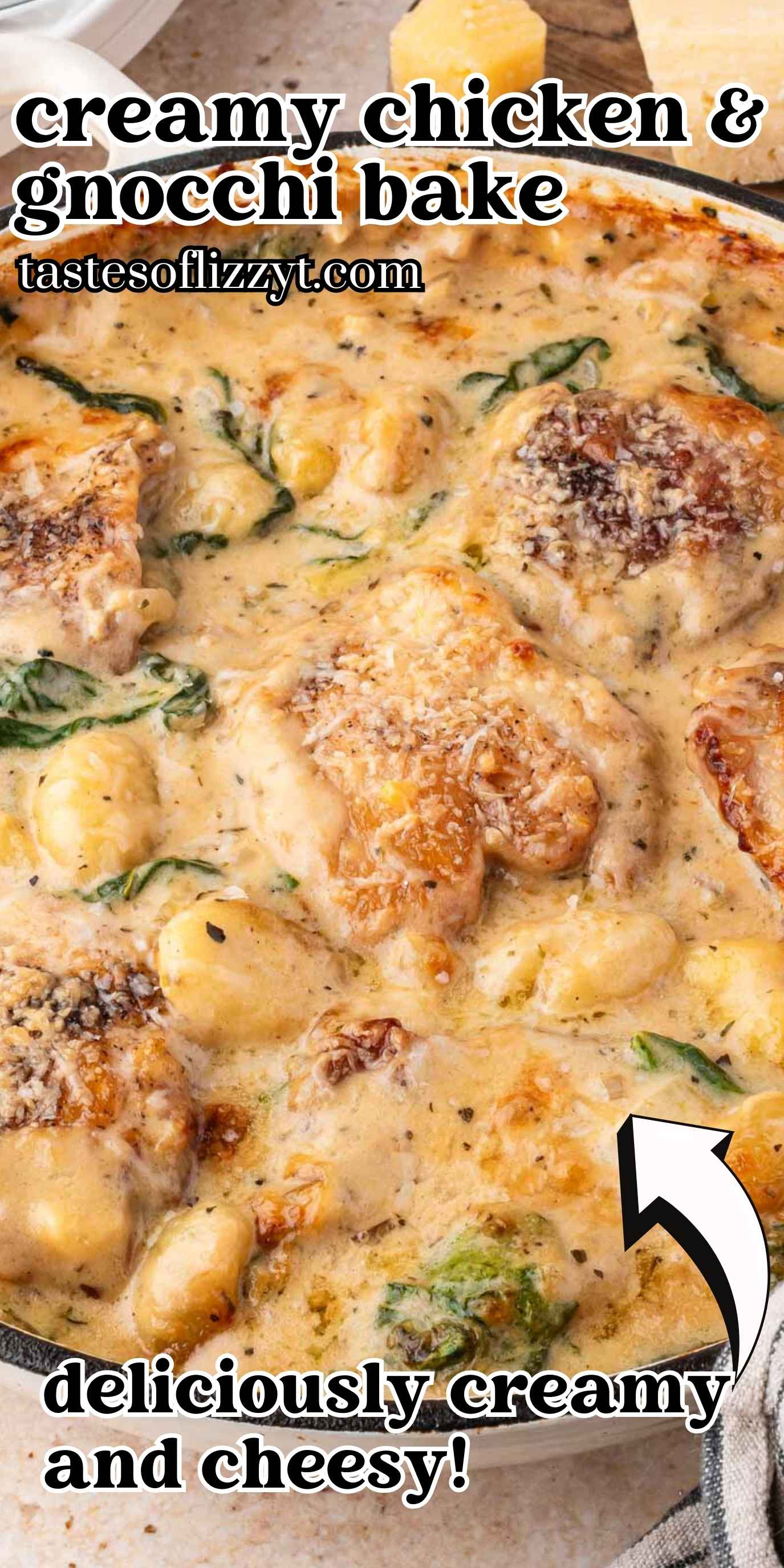 This Chicken and Gnocchi Bake is a one-pan meal that brings together tender chicken thighs, potato gnocchi, and a homemade creamy garlic-herb sauce.