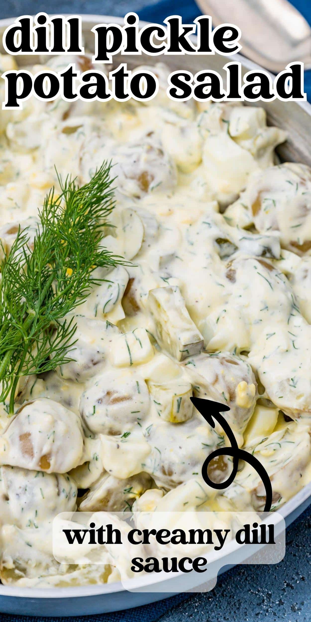 Creamy dill pickle potato salad with yellow potatoes, eggs, pickles and fresh dill. This easy picnic salad recipe comes together quickly.
