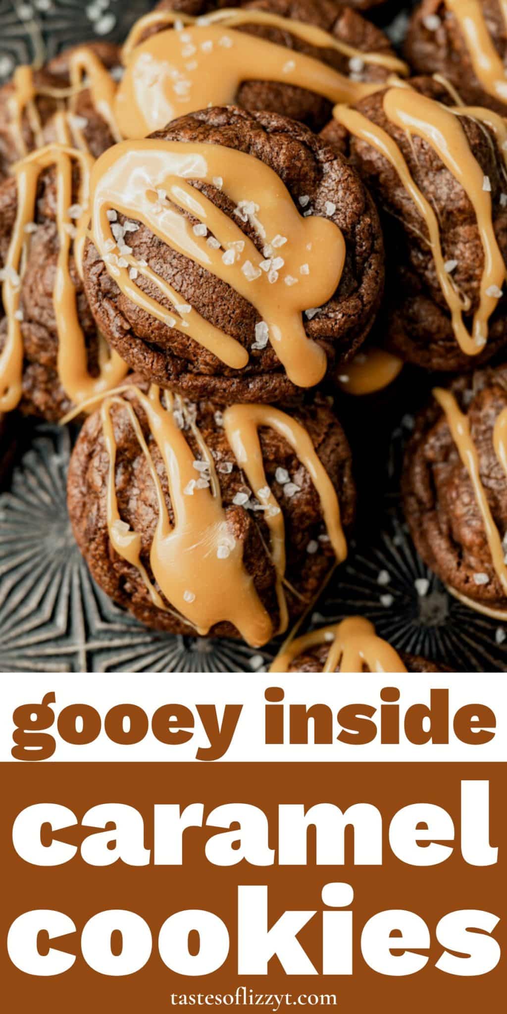 Chocolate cookie dough wrapped around a chocolate caramel candy. Drizzle with melted caramel and sprinkle with sea salt for the fudgiest double chocolate caramel cookies yet.