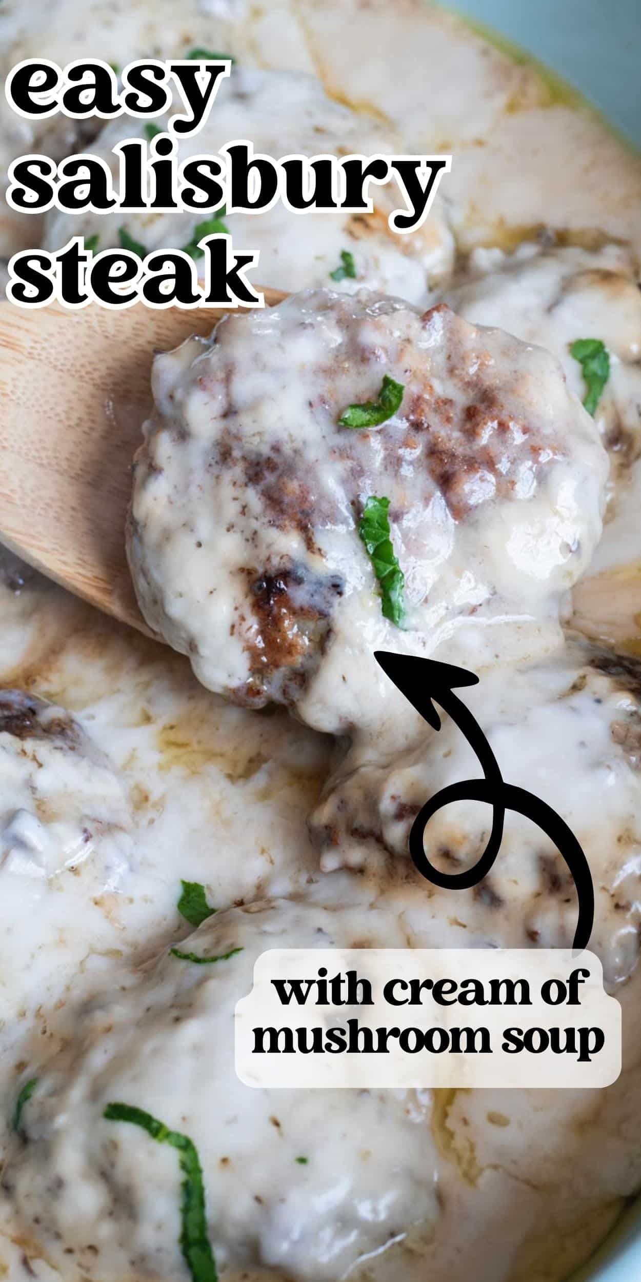 Seasoned and seared hamburger patties get baked in mushroom gravy. This Salisbury Steak with cream of mushroom soup is the ideal comforting main dish.