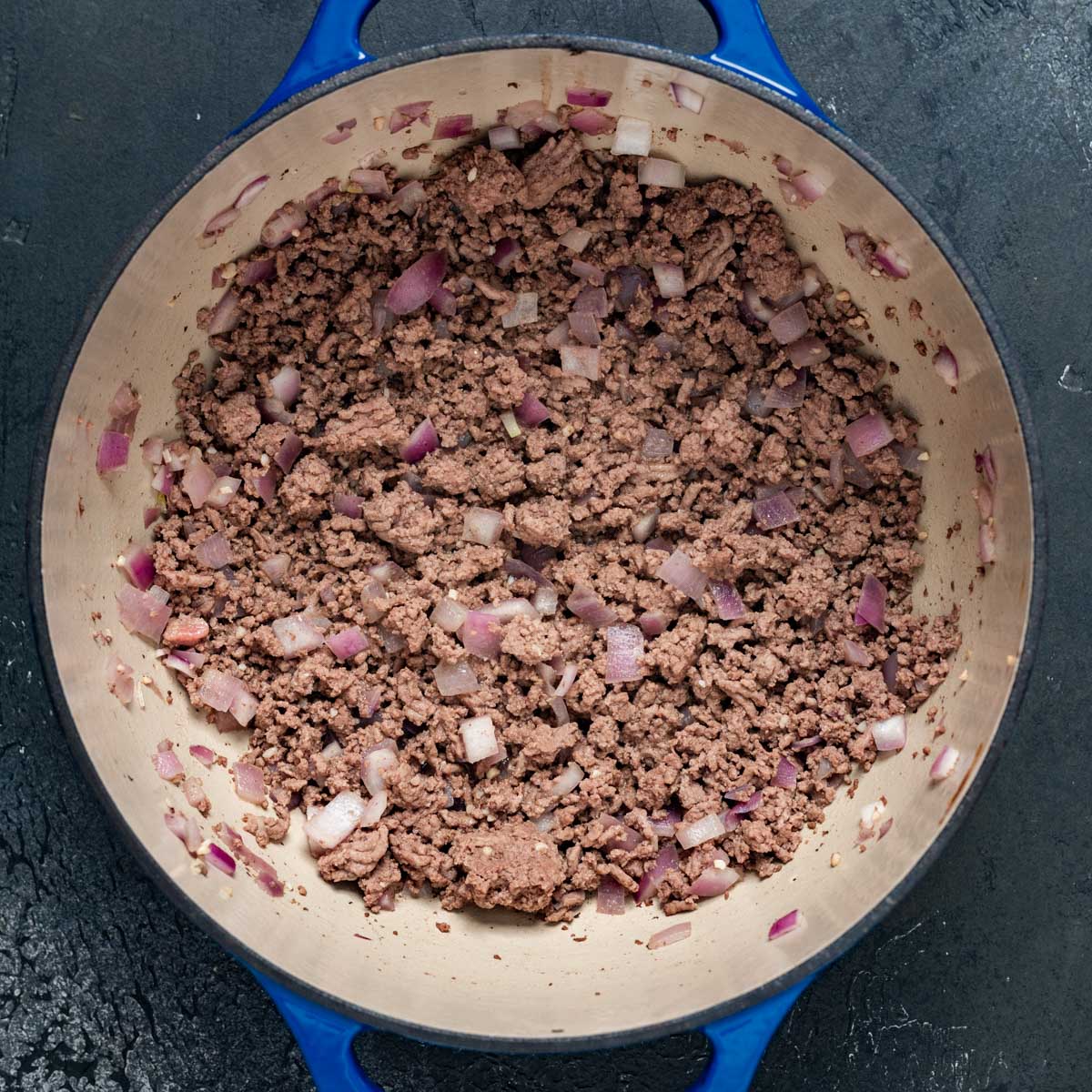 - In a large saucepan or dutch oven, cook the beef, onion and garlic until meat is completely browned. Then drain off any fat. 1 pound ground beef, ¾ cup diced red onion, 1 teaspoon minced garlic