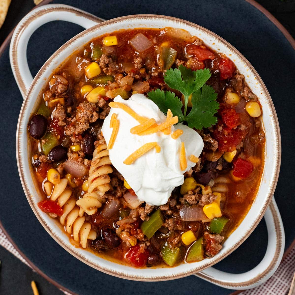 This soup is ready in under 30 minutes and uses pantry staples to create a delicious, nourishing dinner that the whole family will love. It's similar to our Mexican Beef and Rice Soup with noodles swapped for the rice!