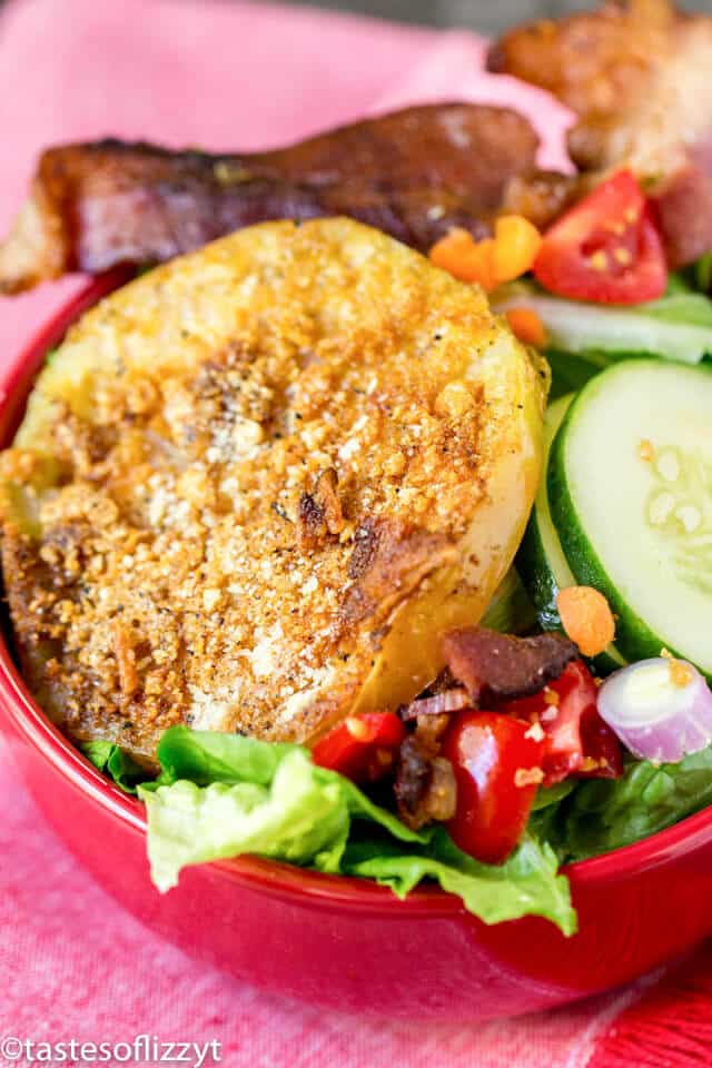 Summer means salad and this fried green tomato salad is a great way to use up some extra garden tomatoes! Top with your favorite salad veggies and you have a low carb dinner recipe that is great for lunches, too!