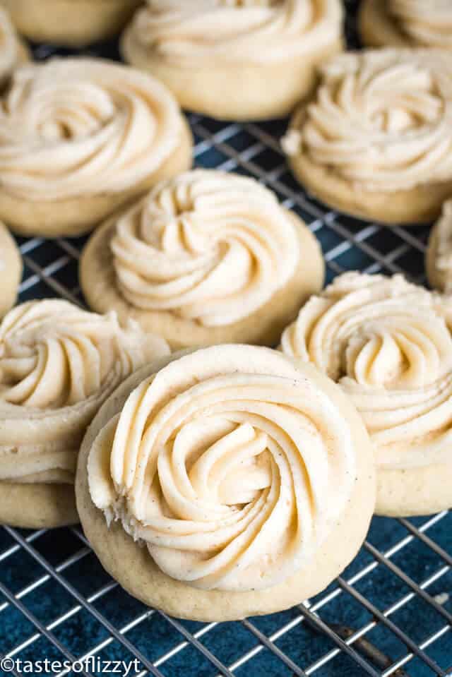 Frosted Eggnog Cookies are made with a soft sugar cookie recipe that's spiked with eggnog. The soft eggnog cookies have a swirl of eggnog frosting on top.