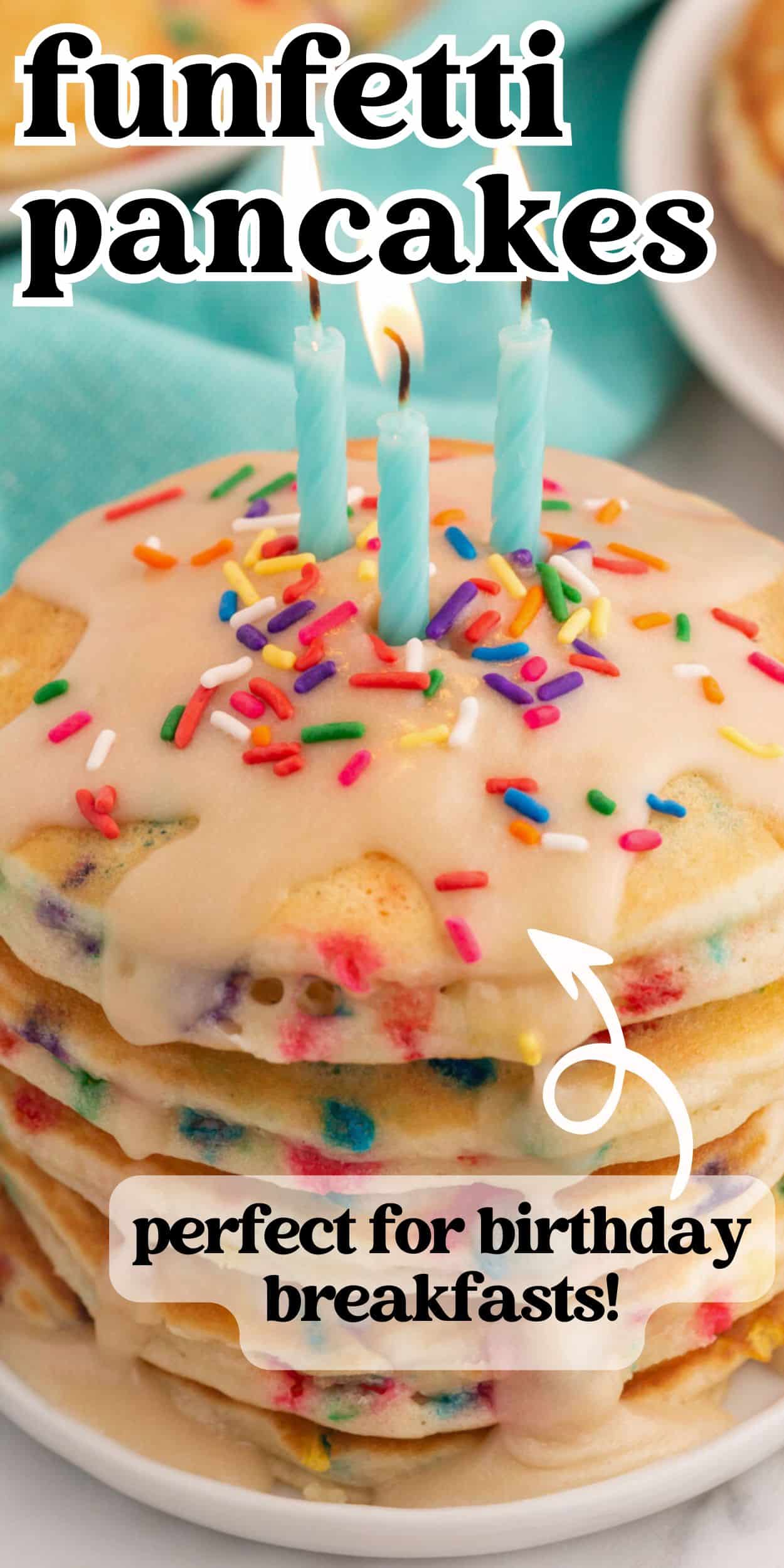 Syrups such as maple syrup or blueberry syrup are great options for funfetti pancakes, too. And for birthday celebrations, don’t forget the candles!
