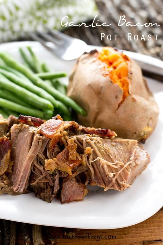 We have company often at our house. When we have guests, I want to fix something delicious, but I also want to not completely blow our healthy “clean” eating. This Garlic Bacon Pot Roast is the perfect solution. Serve it with a side of sweet potatoes and green beans.
