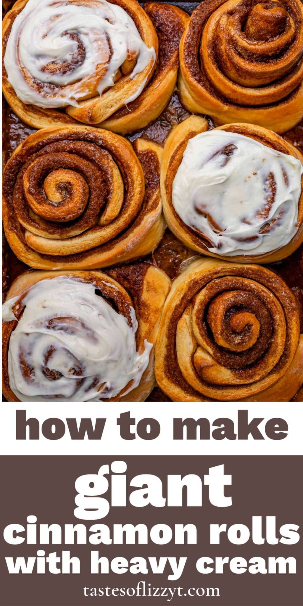 With their signature cream cheese frosting, these huge cinnamon rolls follow our regular cinnamon roll recipe, which uses heavy cream poured over the rolls before baking.