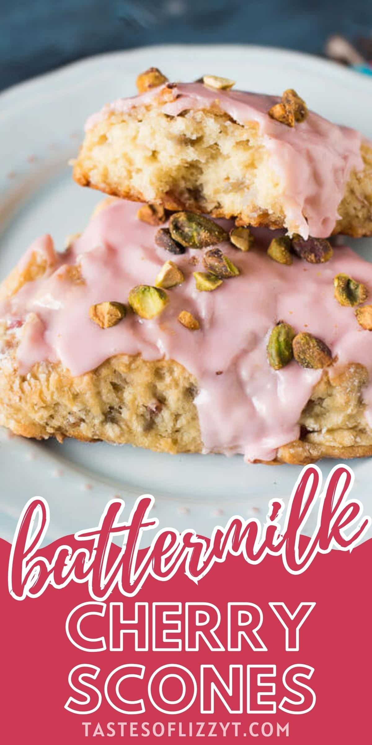 Learn how to make light, buttery, buttermilk cherry scones. These cherry glazed scones are topped with salty pistachio nuts.