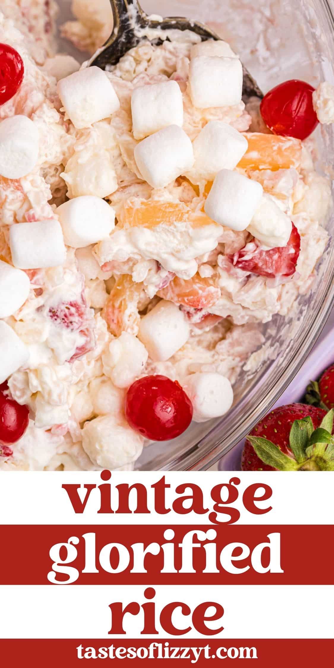 Old Fashioned Glorified Rice is a creamy dessert with marshmallows, strawberries, pineapple… and rice! A unique no bake fruit salad recipe for summer picnics.