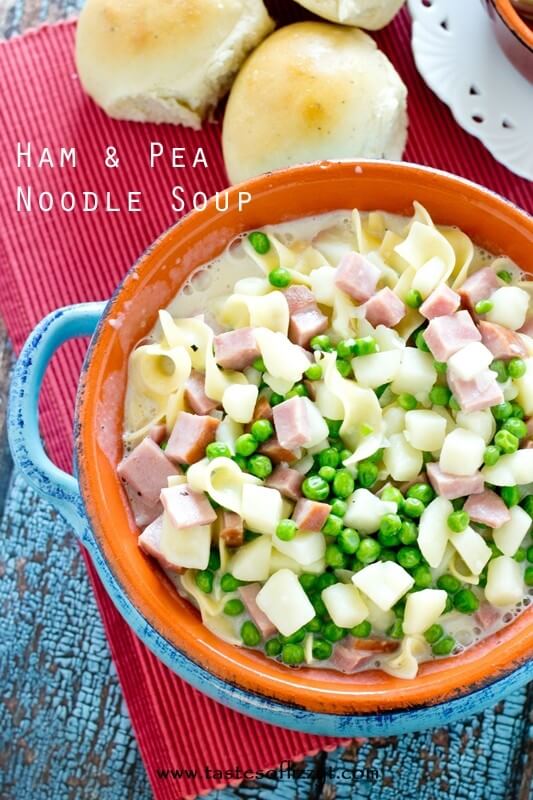 This creamy Ham Noodle Soup is a true comfort meal that the whole family will love. Serve with a side salad and dinner roll for a meal that comes together in just about 30 minutes!Ham & Pea Noodle Soup For those of you who live in cold weather states, how are you faring this winter?  I’m not going to lie. It’s been a bit of a struggle for me.