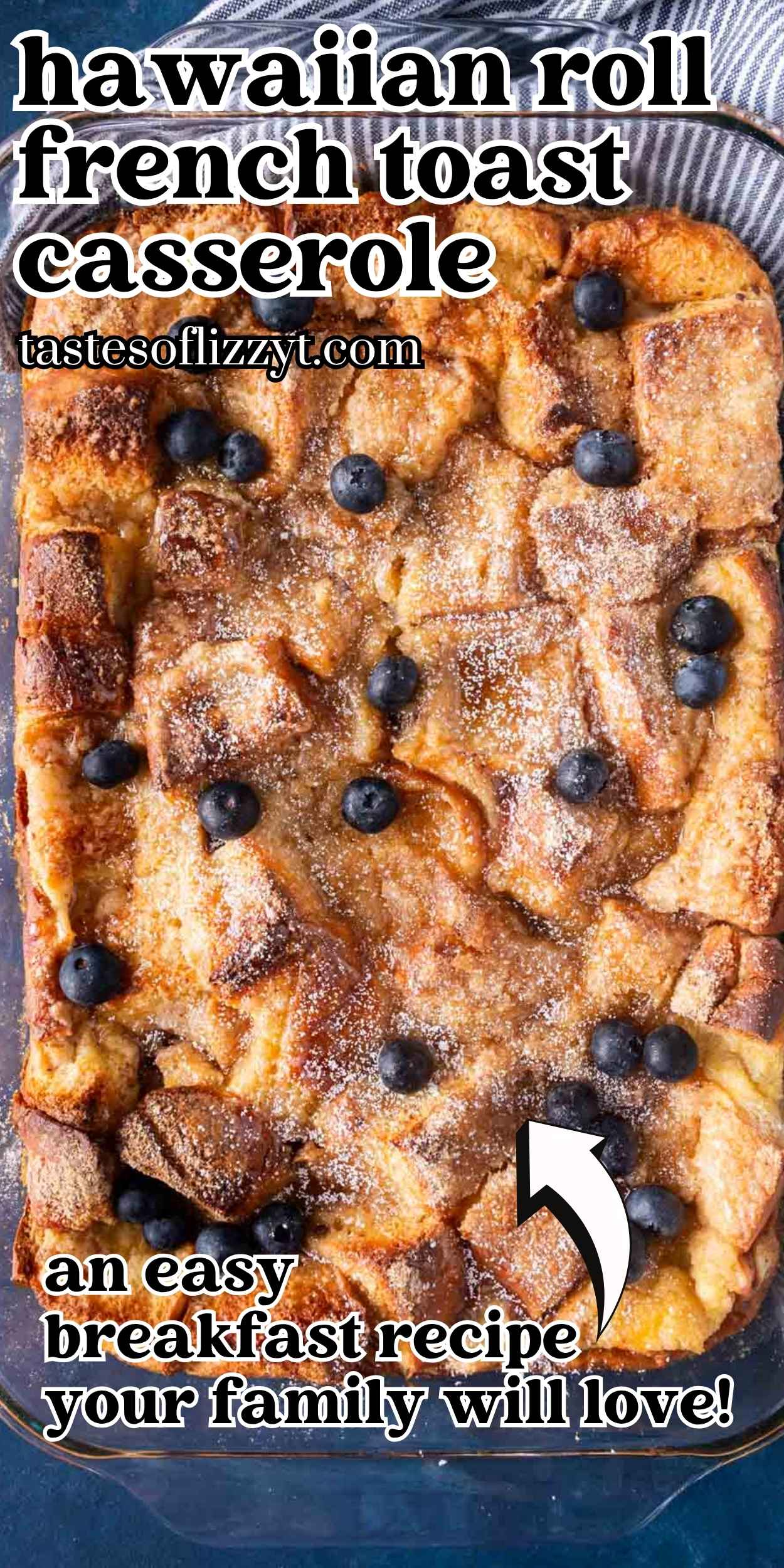 Breakfast was never easier or more family friendly than with this Hawaiian Roll French Toast Casserole. It’s delicious with a drizzle of maple syrup and fresh blueberries.