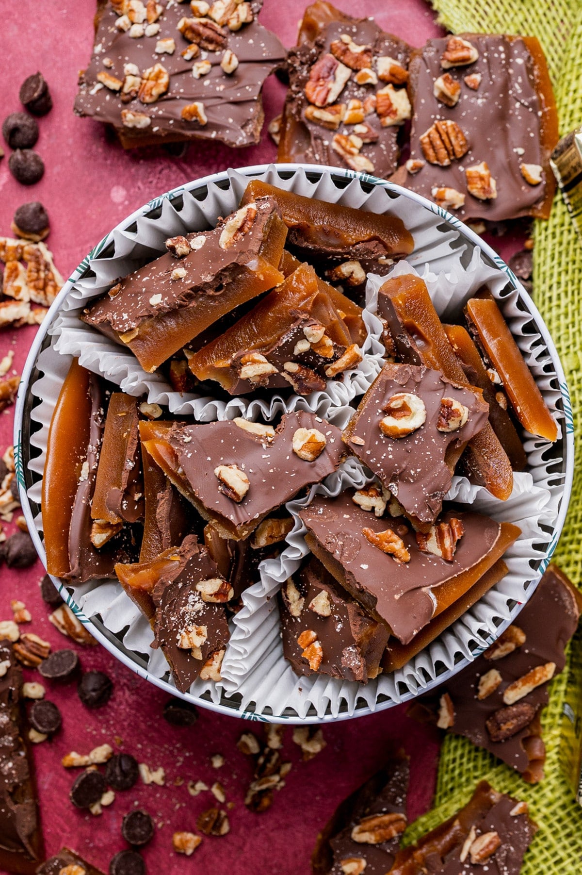 - Add slivered almonds or pecans to the toffee itself before pouring.