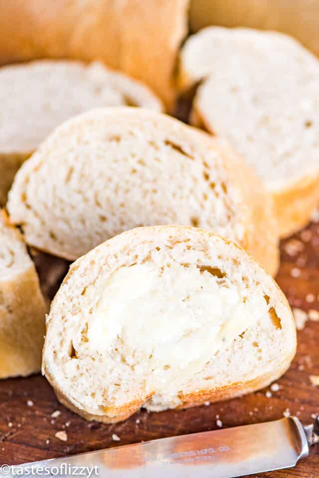 Italian bread is similar to white bread. Italian bread is known for having a moist and absorbent interior that is perfect for soaking up soups and sauces. Italian bread has a little bit of a chewy crust and is often round in shape, although we’ve shaped our Italian bread into loaves.