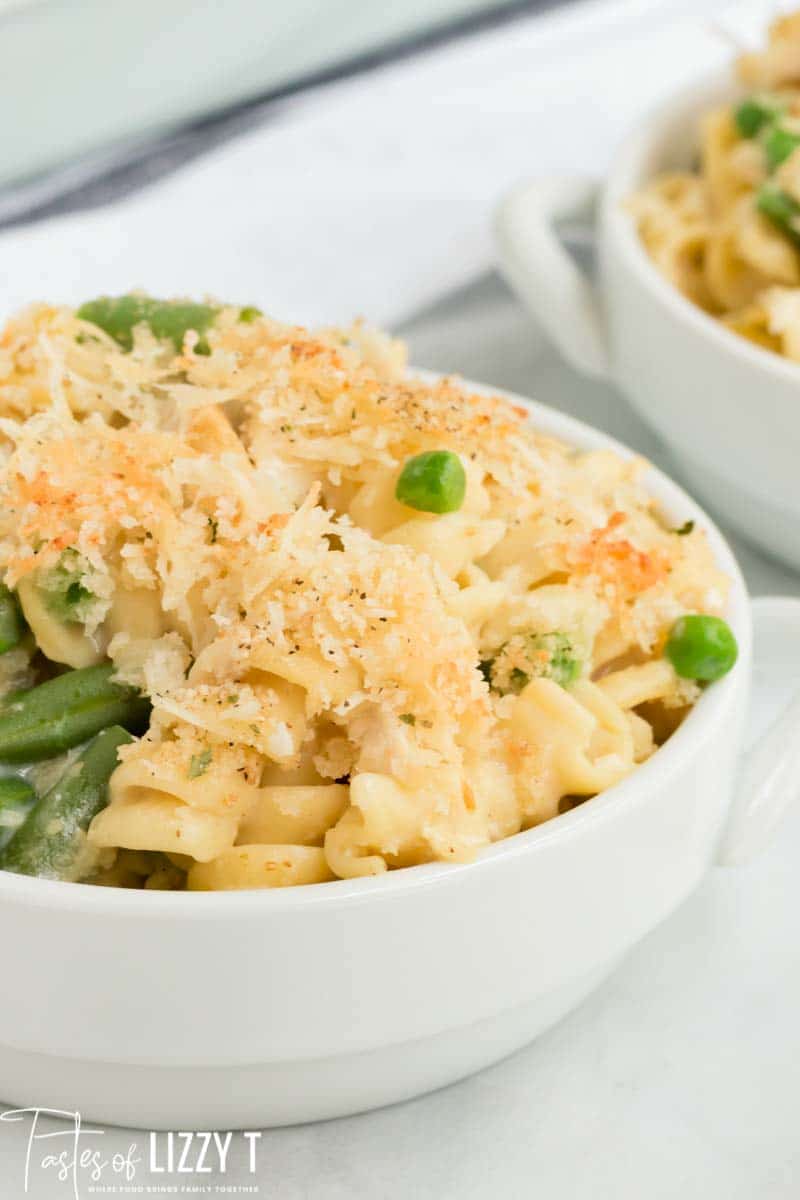 This leftover turkey casserole recipe is made with short noodles tossed in a creamy mushroom and chicken sauce, with bites of peas and green beans, and covered with a simple crunchy and cheese topping!
