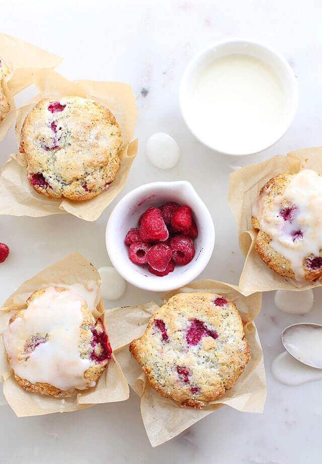 Tender, moist, lemon poppy seed raspberry muffins with a simple lemon glaze. The batter stores well in the fridge so you can have freshly baked muffins every morning!