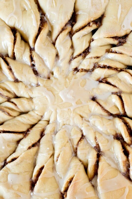 Give each slice two twists, being careful not to tear the thin dough towards the center. Let the dough rise for about 20 minutes, then bake your cinnamon twists until they are golden brown which will take about 14-16 minutes. Top it all off with a simple maple glaze for a mouthwatering finish to these gorgeous, homemade Maple Nut Cinnamon Twists.