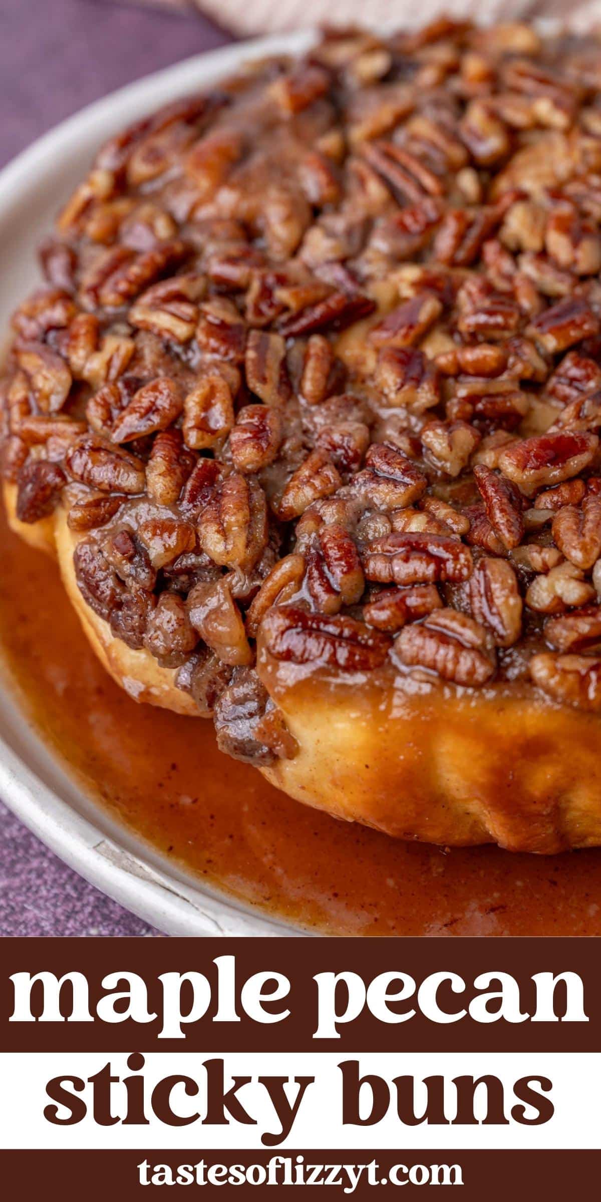 Maple Pecan Sticky Buns are swirled with cinnamon, drenched with maple syrup and topped with pecans and a maple syrup glaze.
