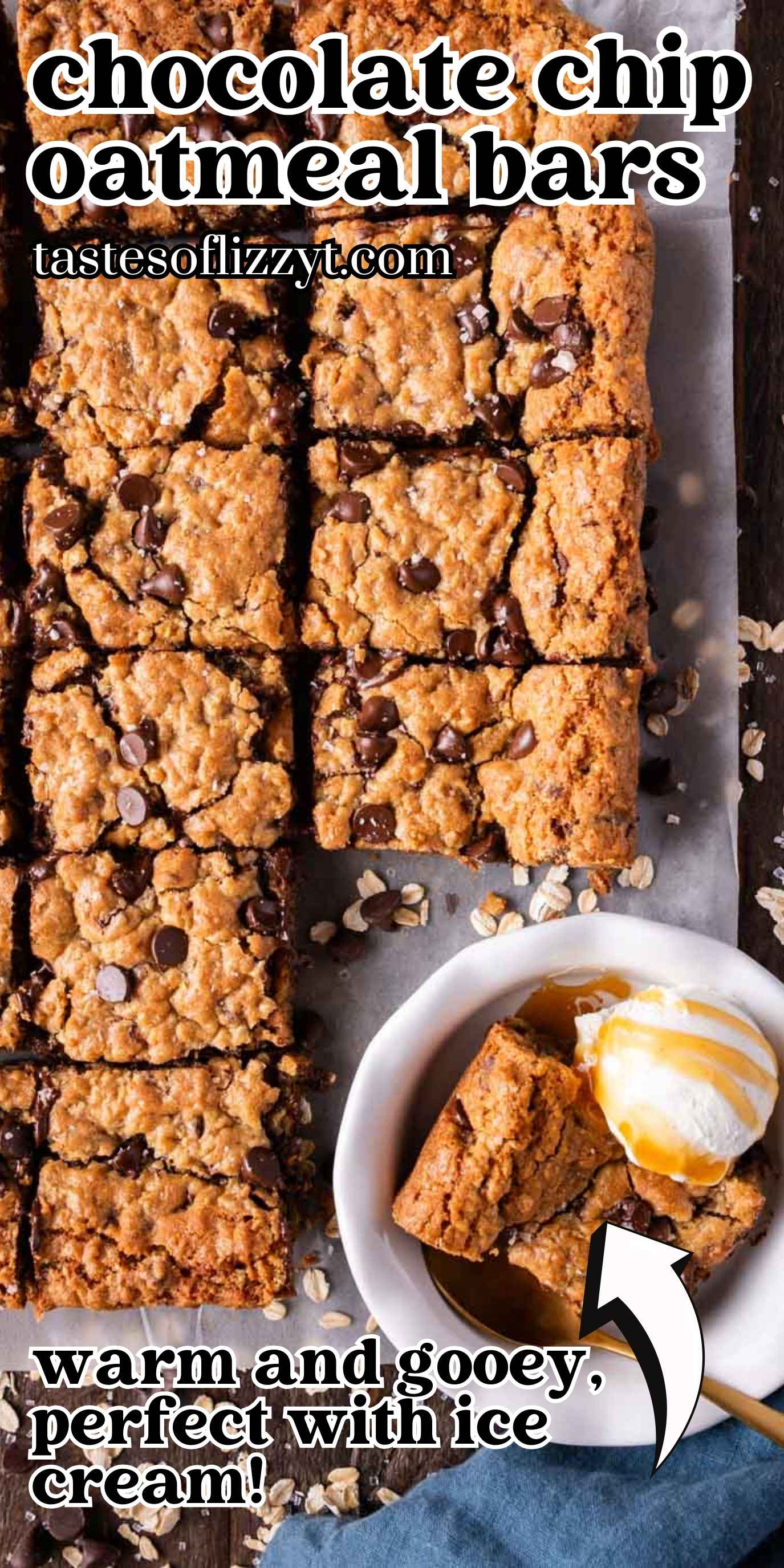 And now I’m sharing them with my kids. The Oatmeal Chocolate Chip Bars are gooey when warm and have a chewy texture when they set. The oatmeal cookie bars are loaded with chocolate in every bite and are irresistible when served with a scoop of vanilla ice cream.