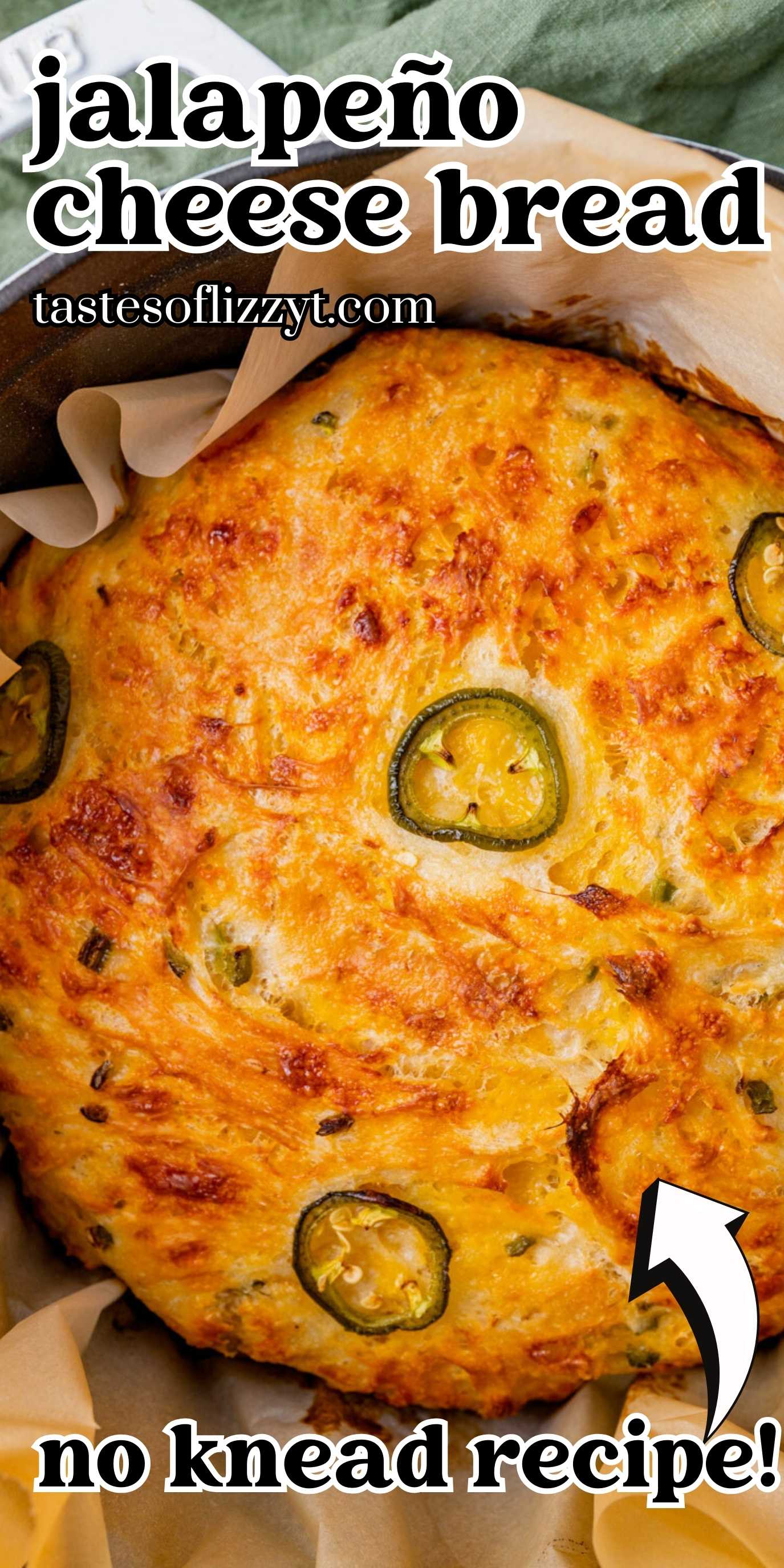 This No Knead Jalapeño Cheese Bread recipe is a perfect blend of spicy jalapeños and shredded cheddar cheese. The artisan bread baked in a dutch oven has a crisp crust and a soft, light, springy crumb.