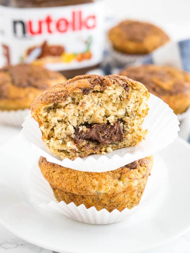 These muffins are not only stuffed with Nutella but they are also topped with more Nutella! They’re every Nutella lovers dream with their gooey Nutella core. And they are so moist because of all the bananas in the batter.